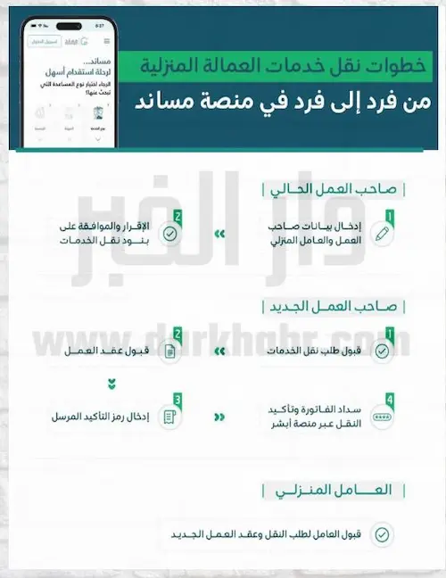 جدير بالذكر أن منصة مساند كانت قد نوهت عن خطوات نقل خدمات العاملة أو العامل المنزلي كما هو مبين أدناة.