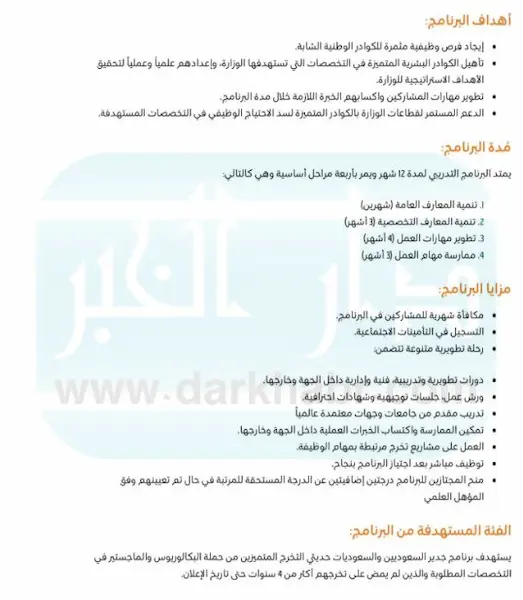 أوضح البيان الوزاري أن برنامج جدير منتهي بالتوظيف، ويستهدف حديثي وحديثات التخرج الجامعيين لأخر 4 سنين مضوا، وسوف يتم تعيين مجتازي البرنامج التدريبي منهم على الوظائف الشاغرة، كما سيتم منحهم درجتين إضافيتين على الدرجة المستحقة وفق المؤهل العلمي.