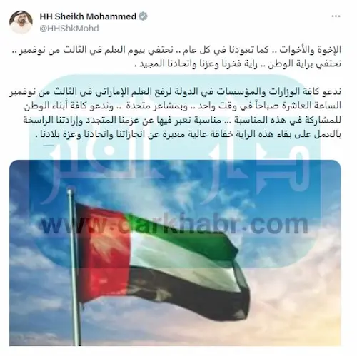 أوضح الشيخ محمد في تغريدته التي تم تناقلها عبر منصة X والمرفقة أدناة، إلى أنه في الثالث من نوفمبر نحتفي براية الوطن، ووصفها براية العز والفخر والاتحاد المجيد، ثم حث الوزارات والمؤسسات بالدولة على رفع العلم الإماراتي في تمام الساعة العاشرة صبحاً من يوم 3-11-2023، وفي نفس الوقت على مستوى أرجاء الوطن، في إشارة تعبر عن اتحاد المشاعر.
