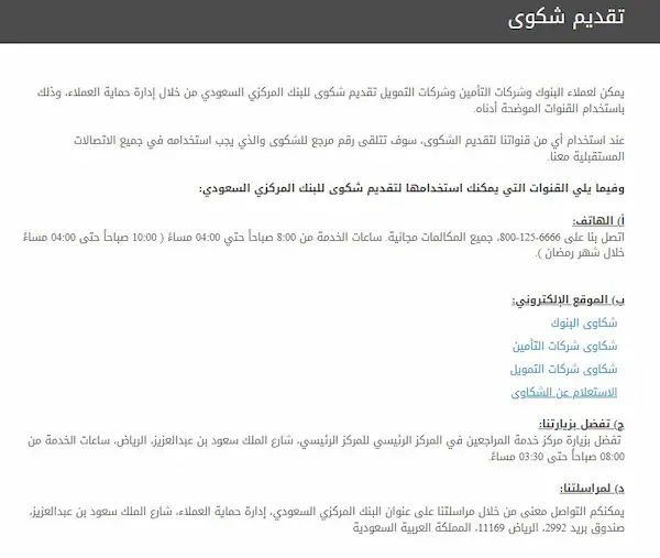 أشار المركزي السعودي إلى القنوات الرسمية التي منها يمكن لعملاء البنوك والشركات المصرفية والتأمينية تقديم الشكاوى والتي تشمل خدمة إرسال الشكاوى عبر الإنترنت والهاتف المصرفي، كما هو مبين أدناة.