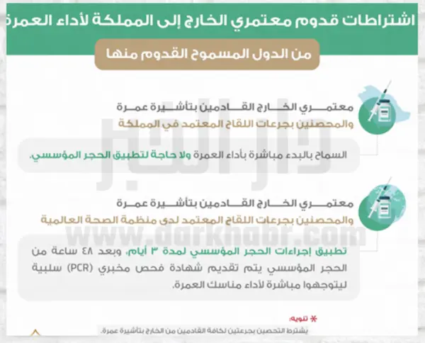 بيّنت الوزارة أن المعتمرين القادمين من الخارج بتأشيرة حج، من حصول عل الجرعات الخاصة باللقاح من تلك الأنواع المعتمدة لدى منظمة الصحة العالمية، فسيتم تنفيذ حجز مؤسسي مدته 3 أيام، ثم تقديم فحص pcr خلال 48 ساعة اللاحقة، وفي حالة سلبية التحليل سيتم التوجه في الخال لأداء مناسك العمرة.