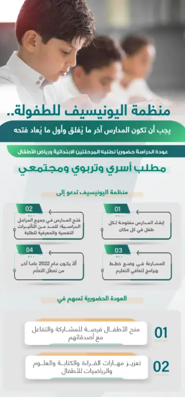 أوضح البيان الذي نقلته وكالة الأنباء السعودية الرسمية “واس”، ما دعت له منظمة “اليونسيف”، نحو ضرورة تغليب مصلحة تعليم الأطفال، والإبقاء على أن تكون المدارس مفتوحة في أي مكان خلال العام الجاري 2022، وذلك بعد التداعيات التي نتجت عنها قرارات الإغلاق في الفترة الماضية، والتحول نحو التعليم عن بُعد، وطالبت المنظمة العالمية الدول بأن تكون المدارس أخر ما يُغلق، وأول المنشآت التي يُعاد فتحها، مع أن تكون عودة الدراسة بالالتزام بتوفير بالتدابير الصحية للحفاظ على سلامة وصحة الطلاب.
